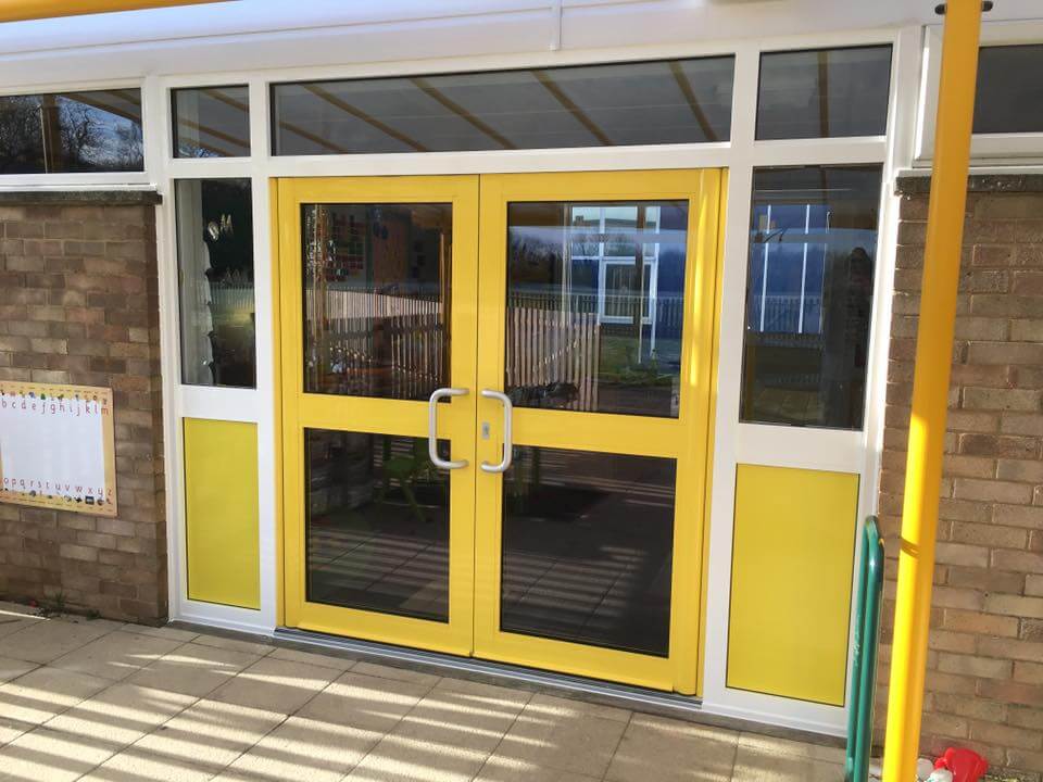 Commercial Project Stowmarket - Aluminium fire escape doors and sidelights. Powder coated in yellow and white marine finish. Installed at a school Stowmarket