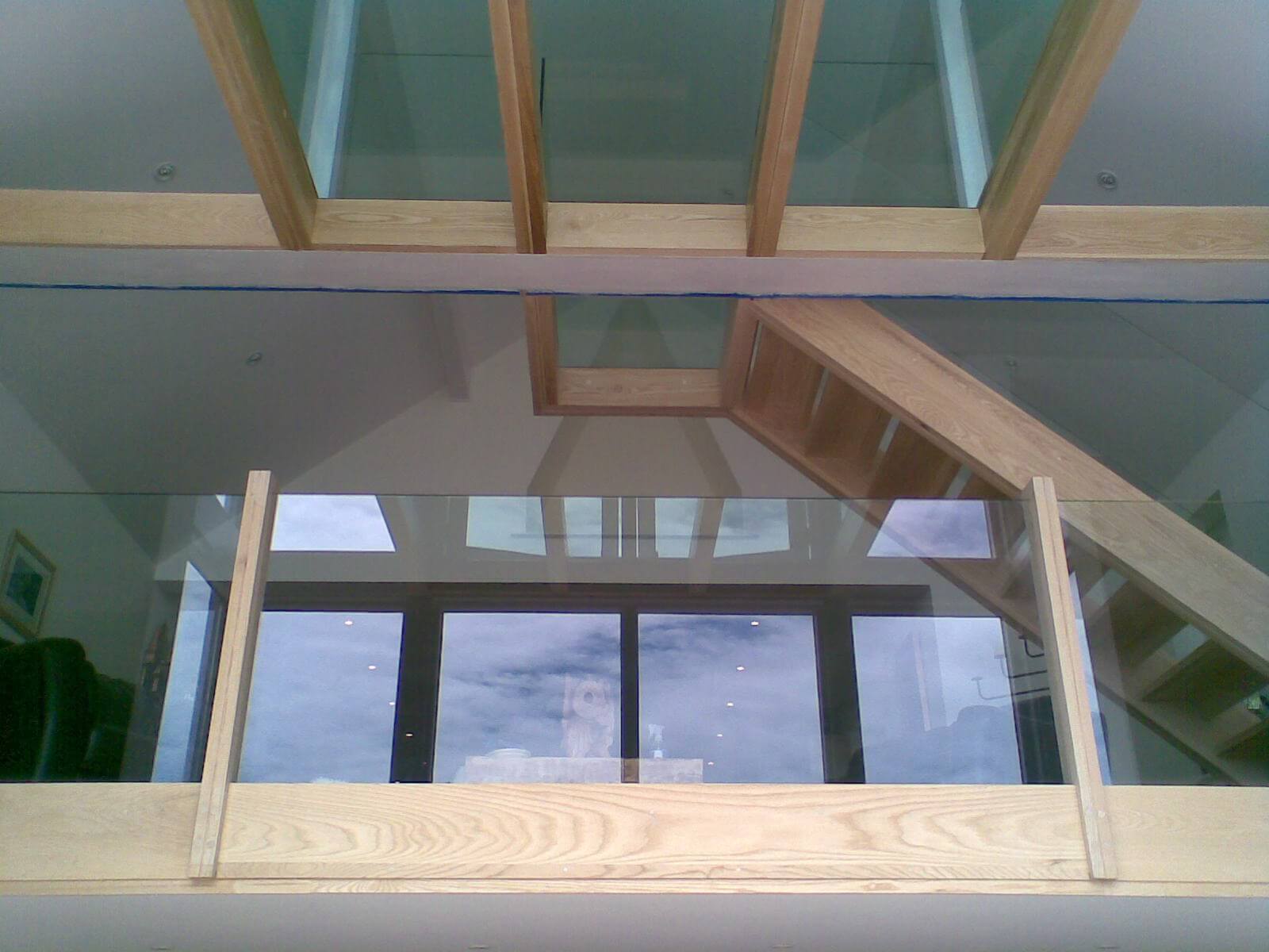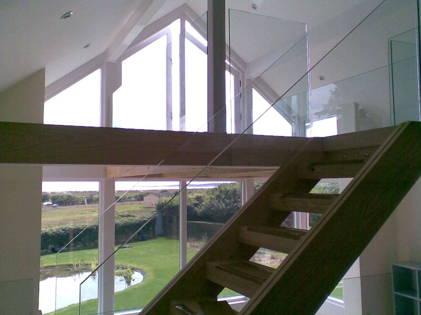 Private Residence - Safety glass balustrade on a stair case with a wooden hand rail and stainless steel track